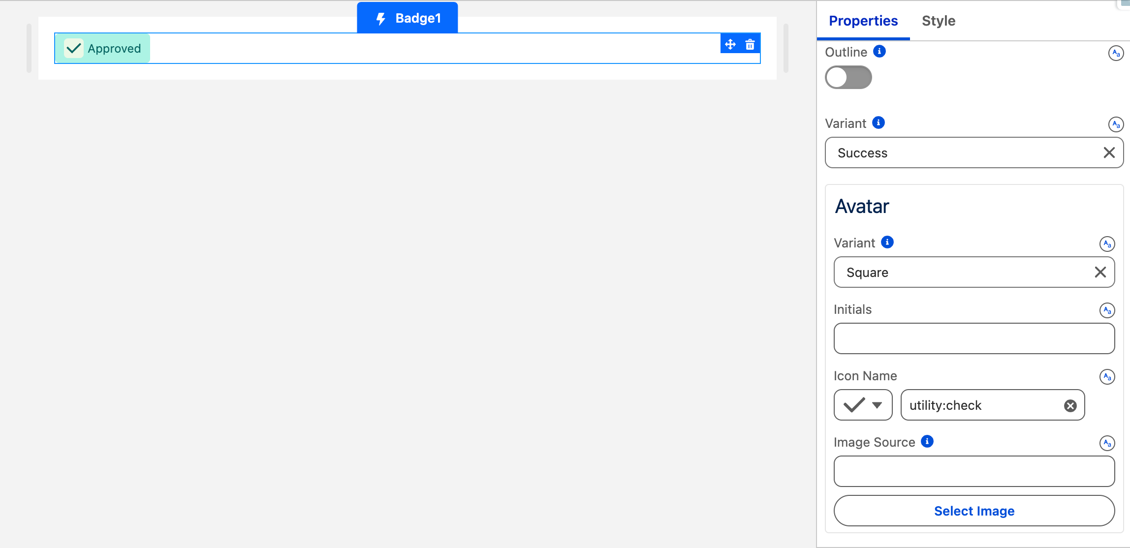 Select the Badge on the canvas to access properties in the right-hand Properties Panel.