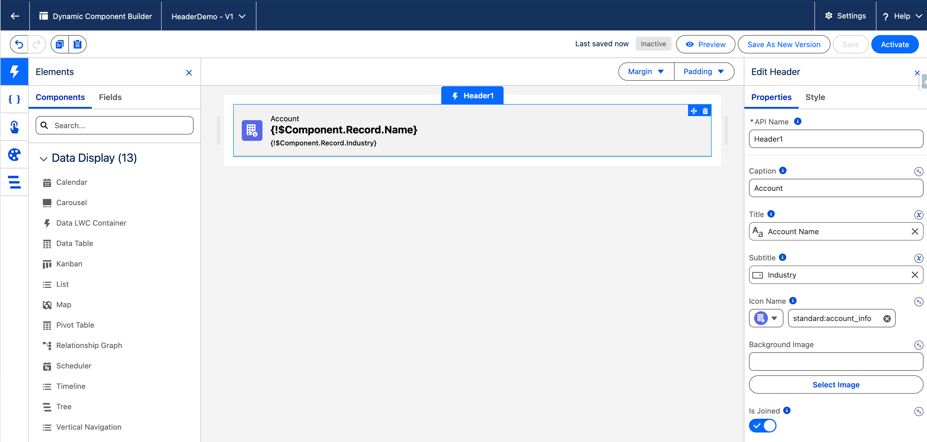 | Caption          | Text/Binding (Optional) | Short text above title; static or bound to Variable/Formula.             | "Account" or {!accountType}                     |
