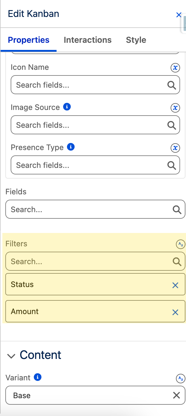 Once you have enabled one or more fields to be filterable, you can adjust how the filter controls are presented to the user. These settings are found in the main **Filter** section of the Kanban component's Properties Panel.