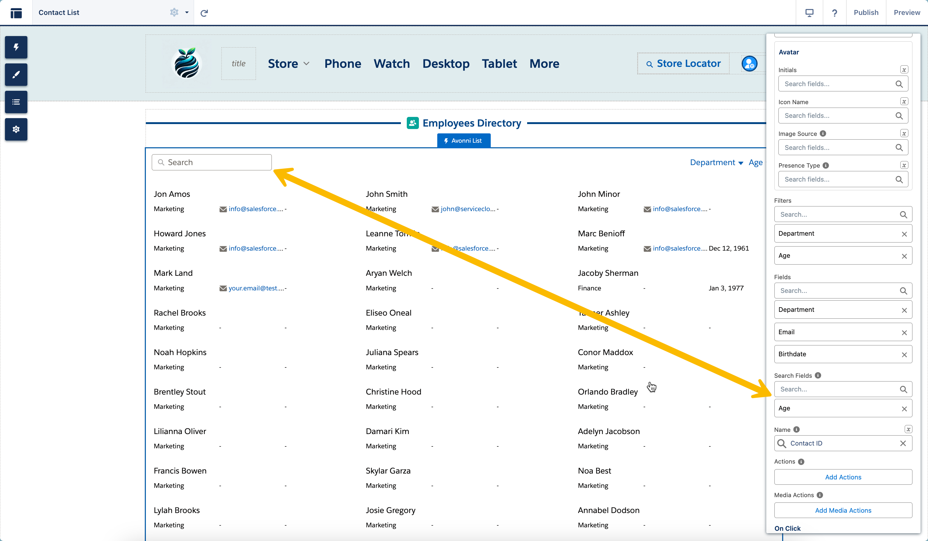 Verwenden Sie das Attribut "Suchfelder", um festzulegen, welche Felder innerhalb der Listenkomponente durchsuchbar sein sollen, damit Nutzer die benötigten Informationen schnell finden können.&#x20;