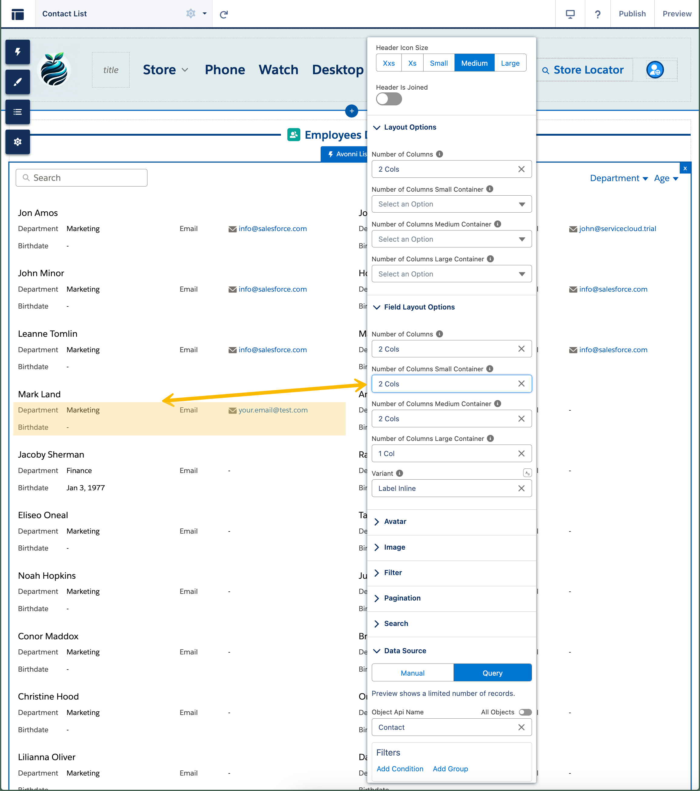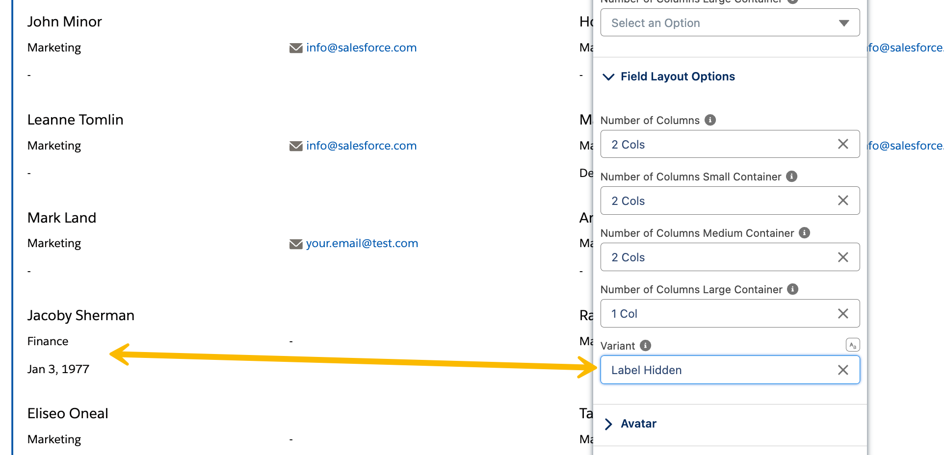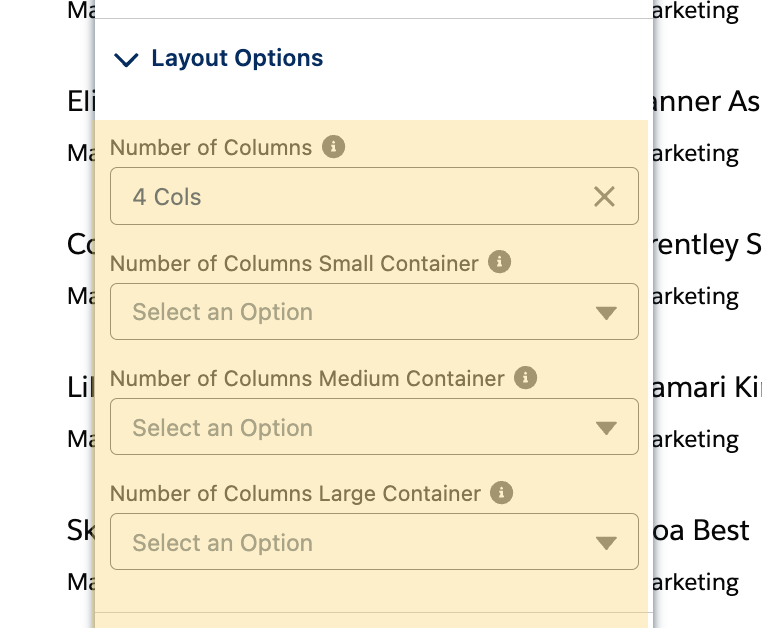 Darüber hinaus bietet die Avonni-Listenkomponente erweiterte Anpassungsmöglichkeiten durch die Option, Spaltenkonfigurationen abhängig von der Bildschirmgröße des Containers festzulegen. Diese Funktion ermöglicht es, das Erscheinungsbild der Liste auf verschiedenen Geräten präzise anzupassen und sorgt so für eine konsistente und benutzerfreundliche Darstellung auf kleinen, mittleren und großen Bildschirmen.&#x20;