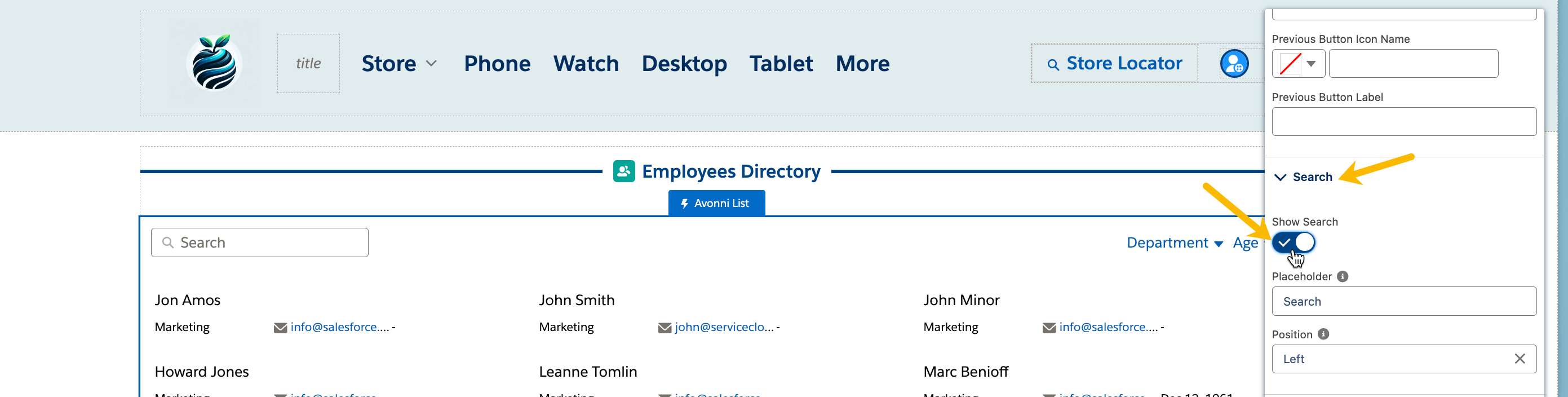 **Suche aktivieren**: Um die Suchfunktion zu aktivieren, navigieren Sie zum Abschnitt Suche und schalten Sie den Schalter "Suche anzeigen" ein. Dadurch wird ein Suchfeld innerhalb der Listenkomponente eingefügt. Sie können diese Funktion anpassen, indem Sie den Platzhaltertext ändern und die Position des Suchfelds nach Bedarf anpassen.