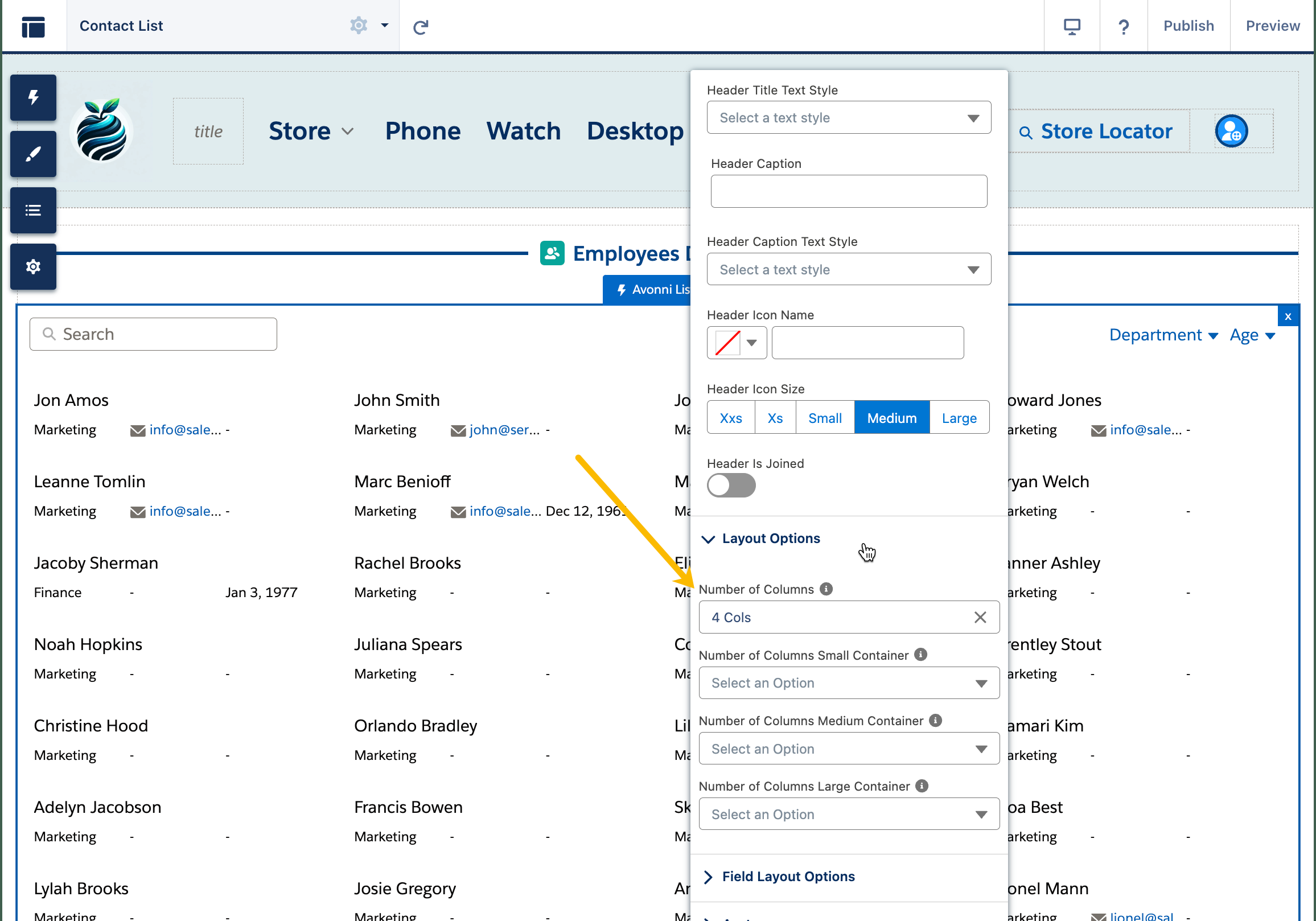 Die Funktion Layoutoptionen innerhalb der Avonni-Listenkomponente ermöglicht es, die Darstellung der Daten innerhalb der Liste festzulegen. Dies geschieht durch die Auswahl der gewünschten Anzahl von Spalten, in denen die Daten angeordnet werden sollen; verfügbar sind Optionen von einer bis zwölf Spalten.&#x20;