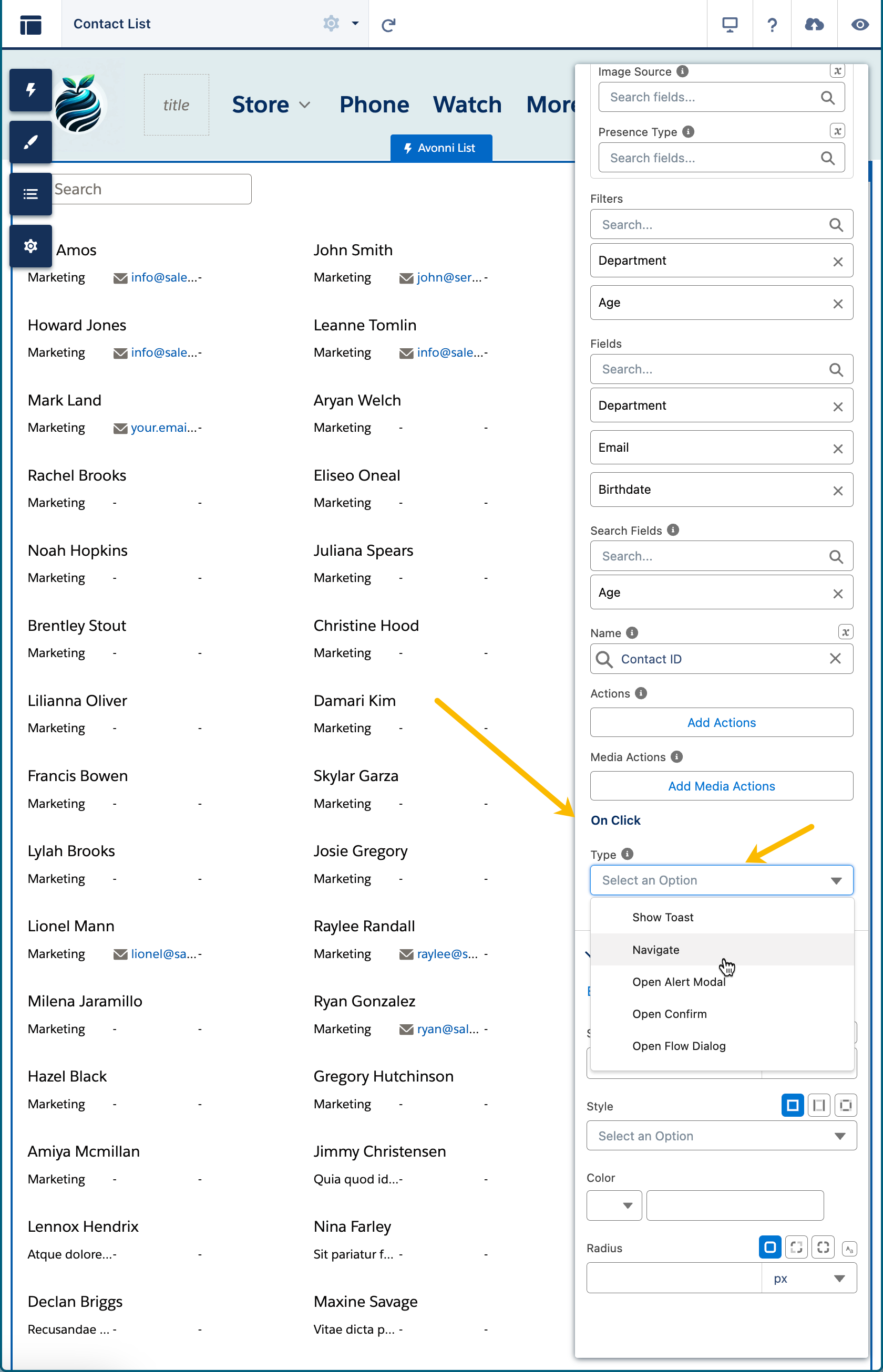 Erkunden Sie jeden Abschnitt, um Einblicke in die Konfiguration dieser Funktionen zu erhalten und die Interaktivität für Ihre Endnutzer innerhalb der Avonni-Listenkomponente zu verbessern.