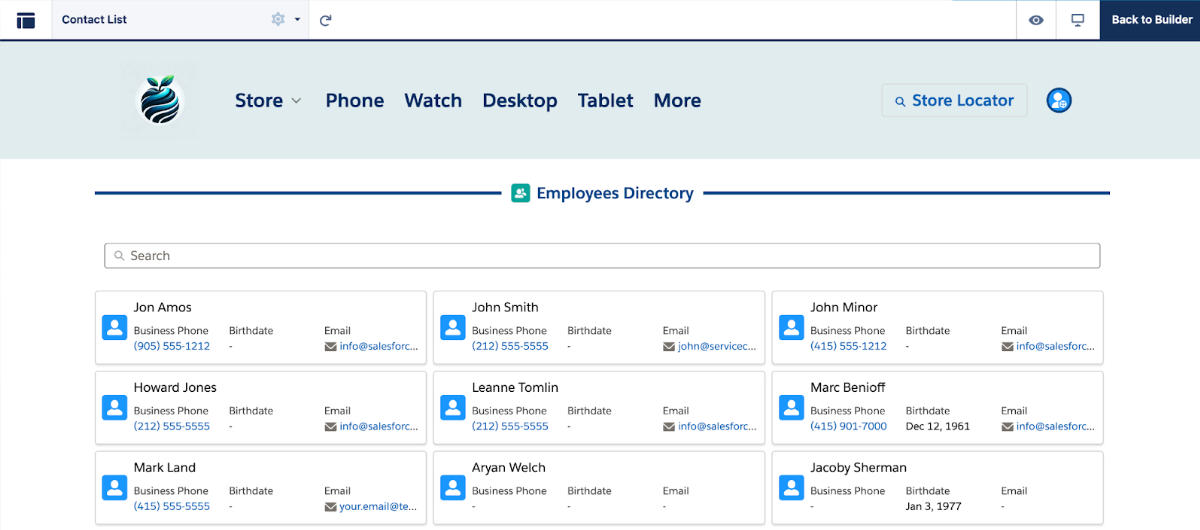Verwenden Sie sie, um Portalnutzern gefilterte Datensätze anzuzeigen – etwa ihre Bestellungen, Fälle, Verträge oder andere zugehörige Daten – mit voller Kontrolle darüber, welche Felder auf jeder Karte erscheinen. Nutzer können suchen, filtern, durch Ergebnisse blättern und auf Karten klicken, um zu Datensätzen zu navigieren. Ziehen Sie Daten aus jedem Standard- oder benutzerdefinierten Objekt in Experience Builder.