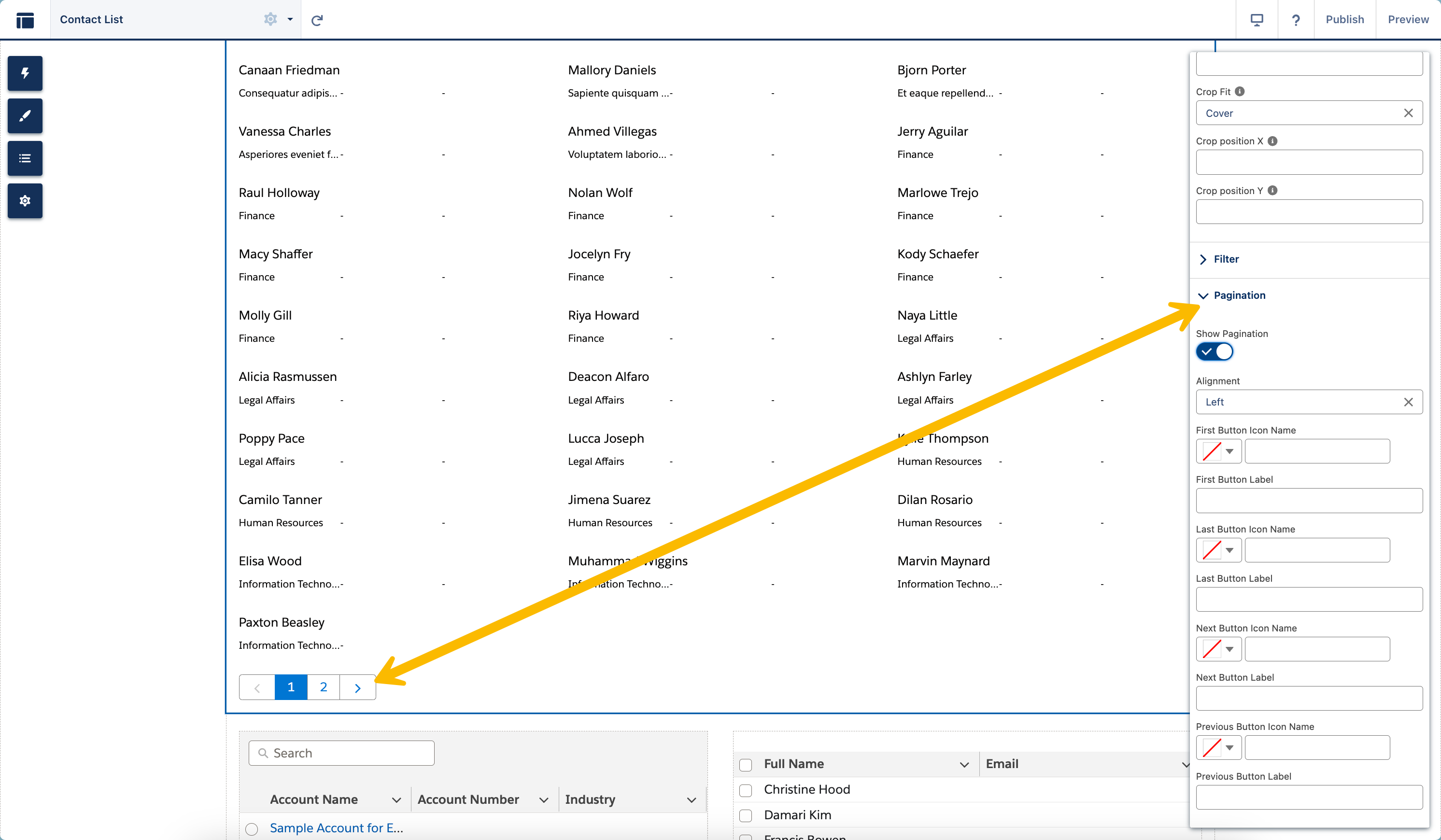El área "Opciones de paginación" te permite dividir listas largas en partes más pequeñas en el componente Lista Avonni. Puedes elegir cuántos elementos se muestran en cada página y cómo se ven los controles. Esto facilita el manejo de listas extensas.
