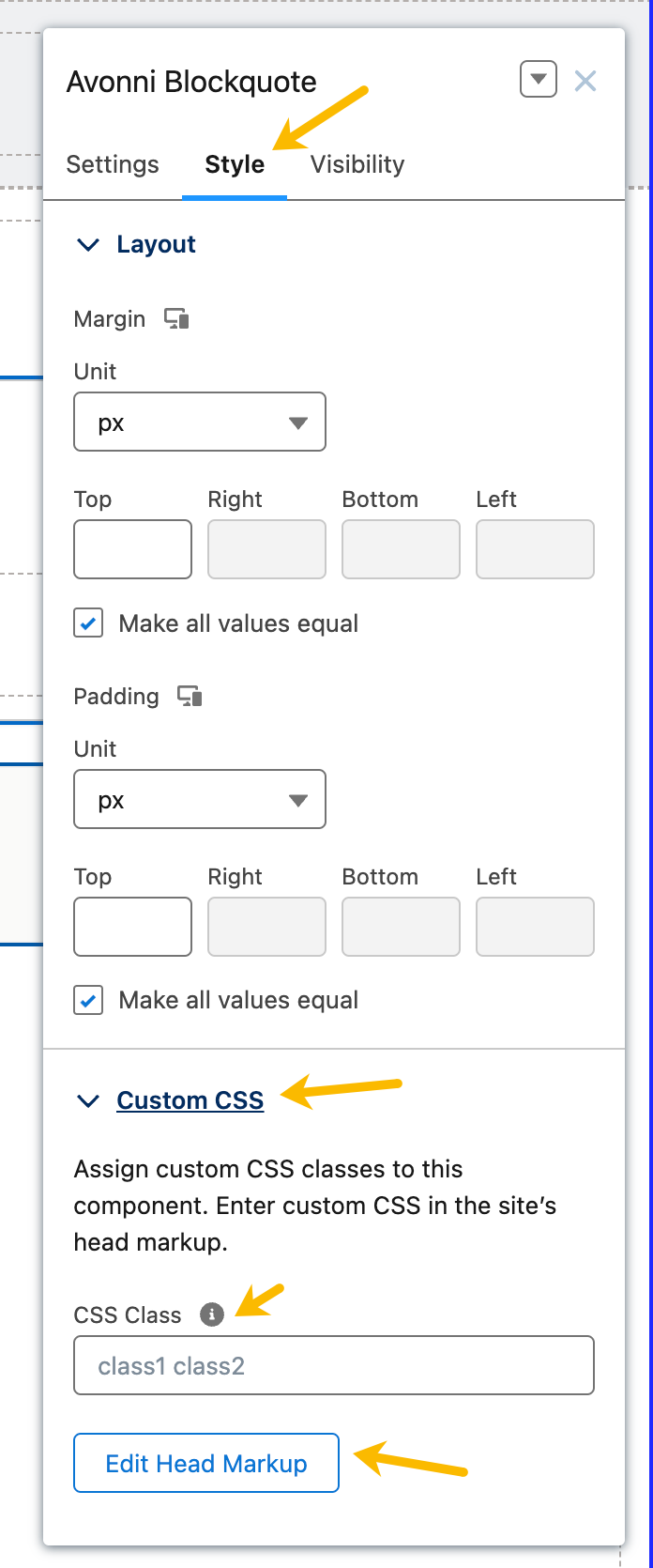 Appliquer aux composants : Ajoutez les noms de vos classes CSS personnalisées aux composants Avonni