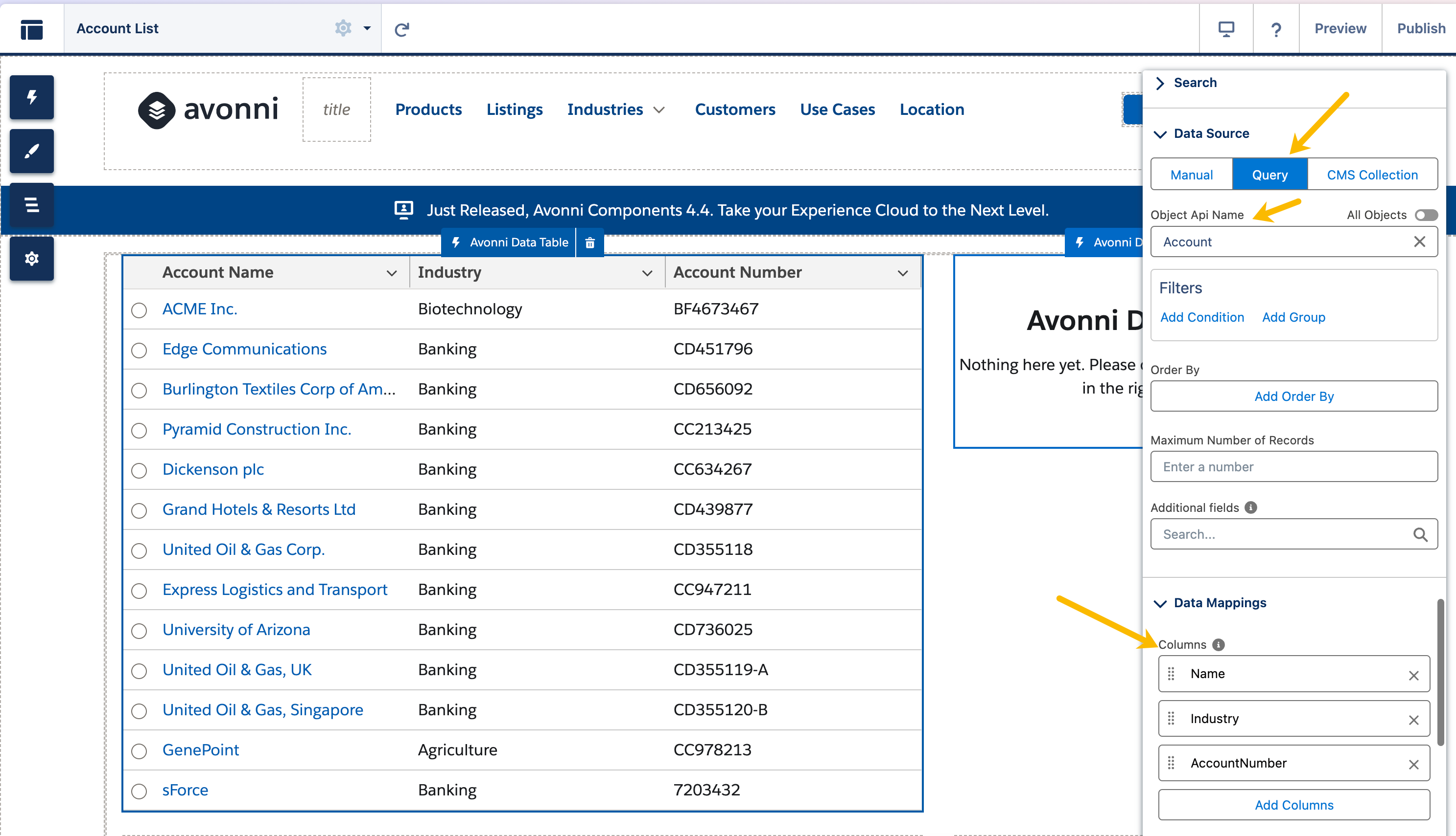 * このテーブルにAPI名を設定していることを確認してください `accountsDatatable`.