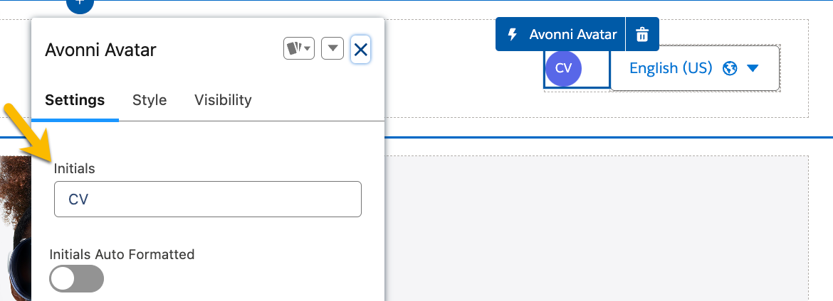 Avonni コンポーネントを動的にするには、 [Experience Cloud 式](https://docs.avonnicomponents.com/experience-cloud/experience-cloud-ja/hajimeni/wobu#expressions)を使用できます。例えば、以下の Avatar コンポーネントでは、次の式を使用して現在ログインしているユーザーの名前を自動的に表示できます: