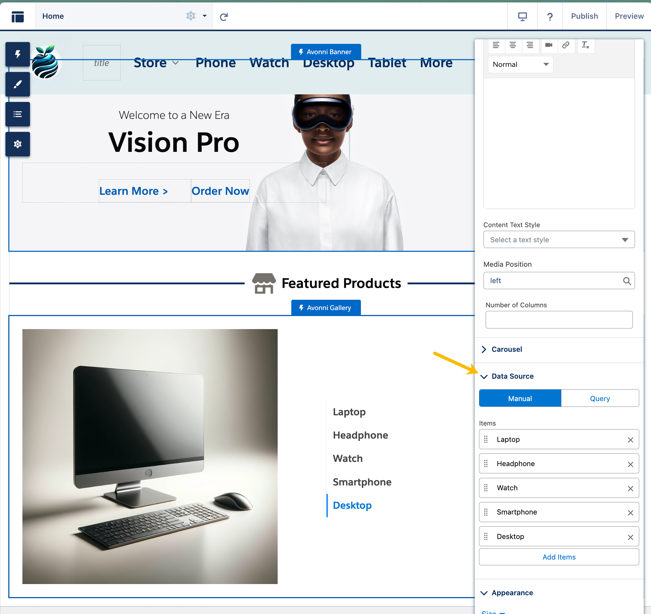 Avonni ギャラリーのスタイル属性を確認しましょう。カルーセルバリアントでもタブバリアントでも、コンテンツの見た目を洗練させるために設計されています。