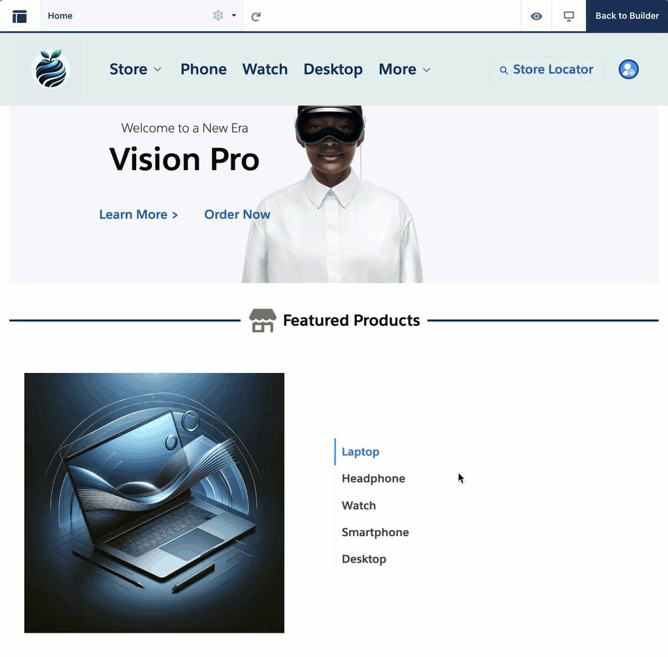 ホームページから直接、製品カタログを視覚的に魅力的に発見できる体験を顧客に提供します。AX Gallery コンポーネントと Product データを組み合わせることで、注目製品を強調し、訪問者を製品詳細ページへ直接誘導する、目を引くカルーセルを作成できます。