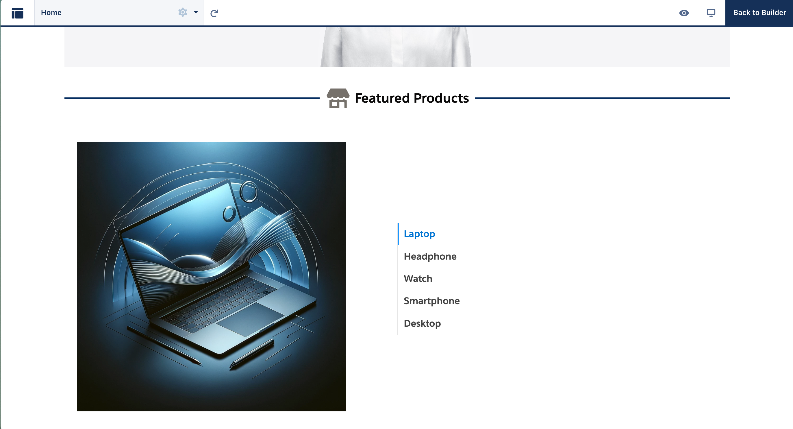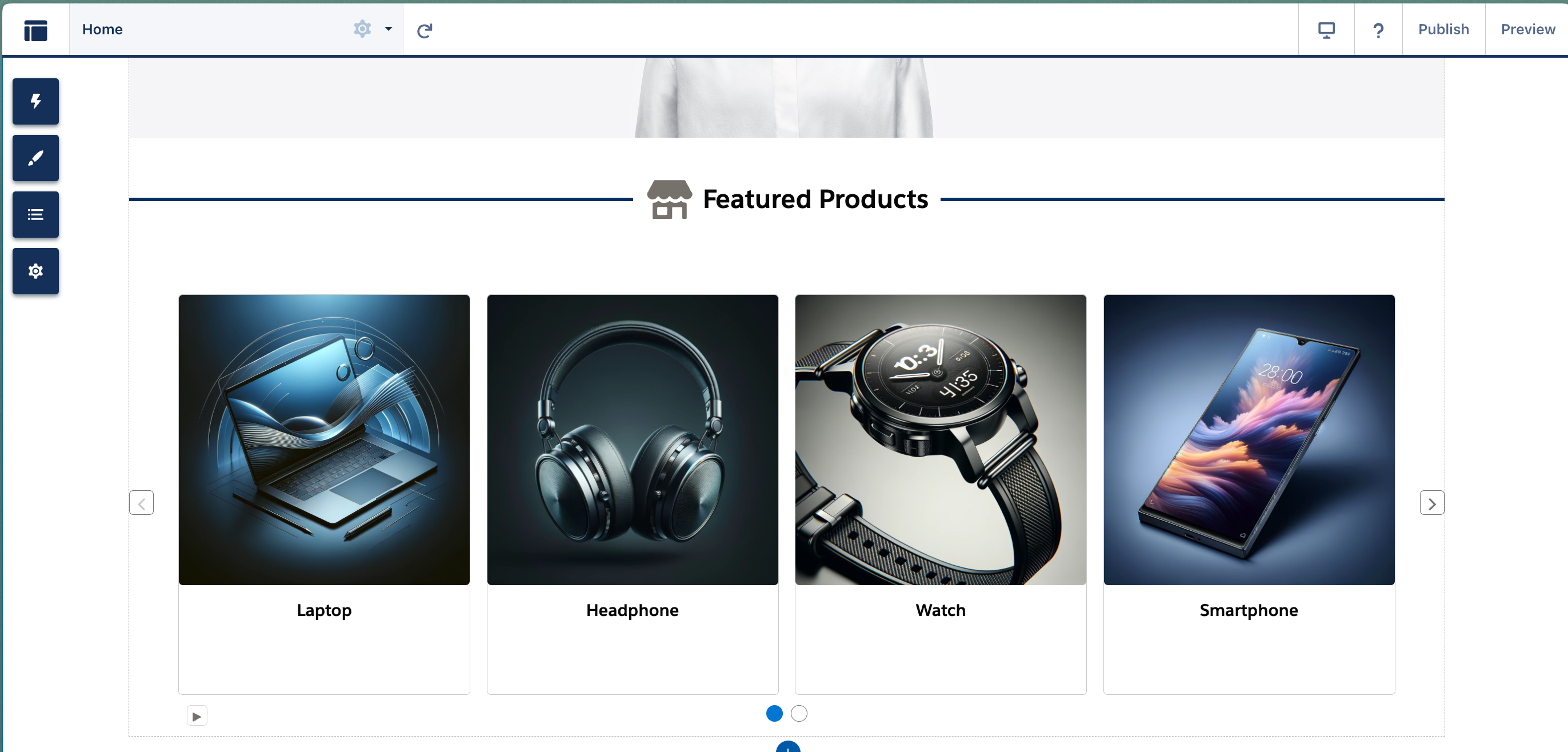* 公開前に Experience Builder のプレビューを使用して、製品、画像、カルーセルのレイアウトが期待どおりに表示されることを確認します。