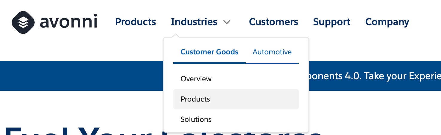 **AX - ナビゲーション** は、Experience Sites ページ上にリンクやメニューを備えたカスタマイズ可能なナビゲーションバーを表示する Experience Cloud コンポーネントです。