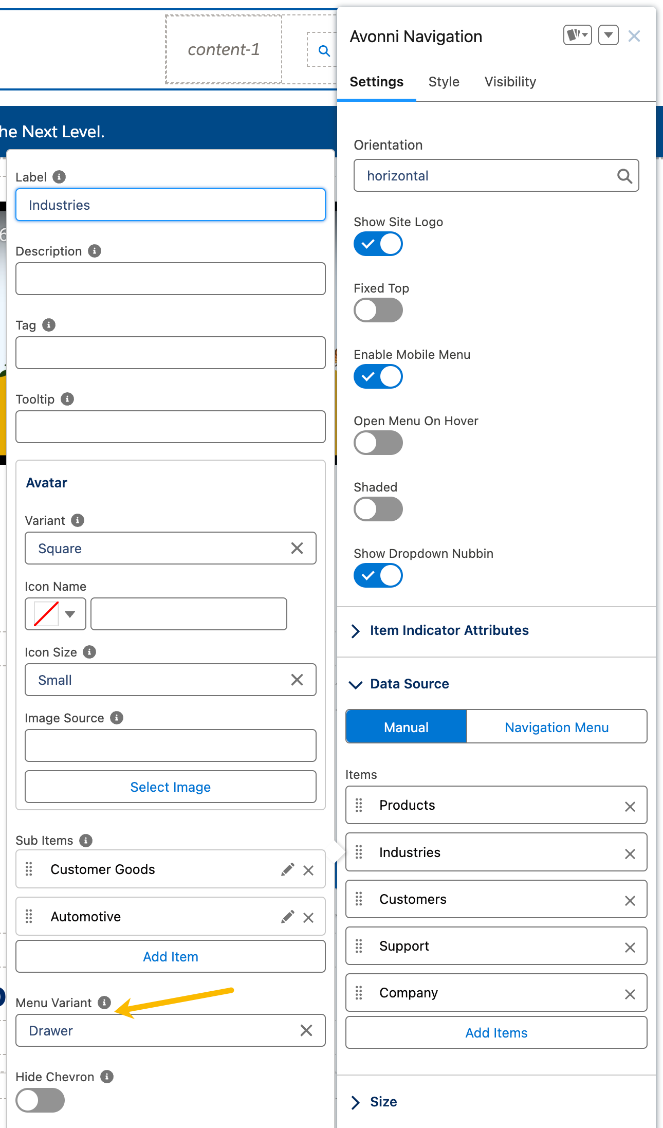 この **`メニューバリアント`** 設定は、Salesforce Experience Cloud 用 Avonni Navigation コンポーネント内で、メニュー全体のスタイルと動作を決定します。&#x20;