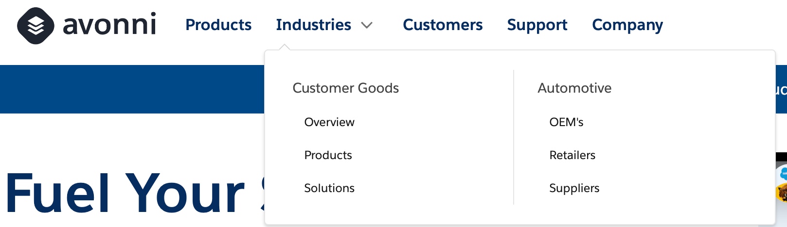 Avonni Navigation コンポーネントは、より高い柔軟性を念頭に設計されています。標準の Salesforce ナビゲーションとは異なり、より複雑なメニュー構造を実現できます。複数レベルのメニューを作成でき、これらはレイヤーや段階のようなものと考えられます。たとえば、メイン項目（レベル 1）、その下のサブ項目（レベル 2）、さらにその下のサブサブ項目（レベル 3）を作成できます。この階層的なアプローチにより、大量の情報を構造化され、アクセスしやすい形で整理して提示しやすくなります。