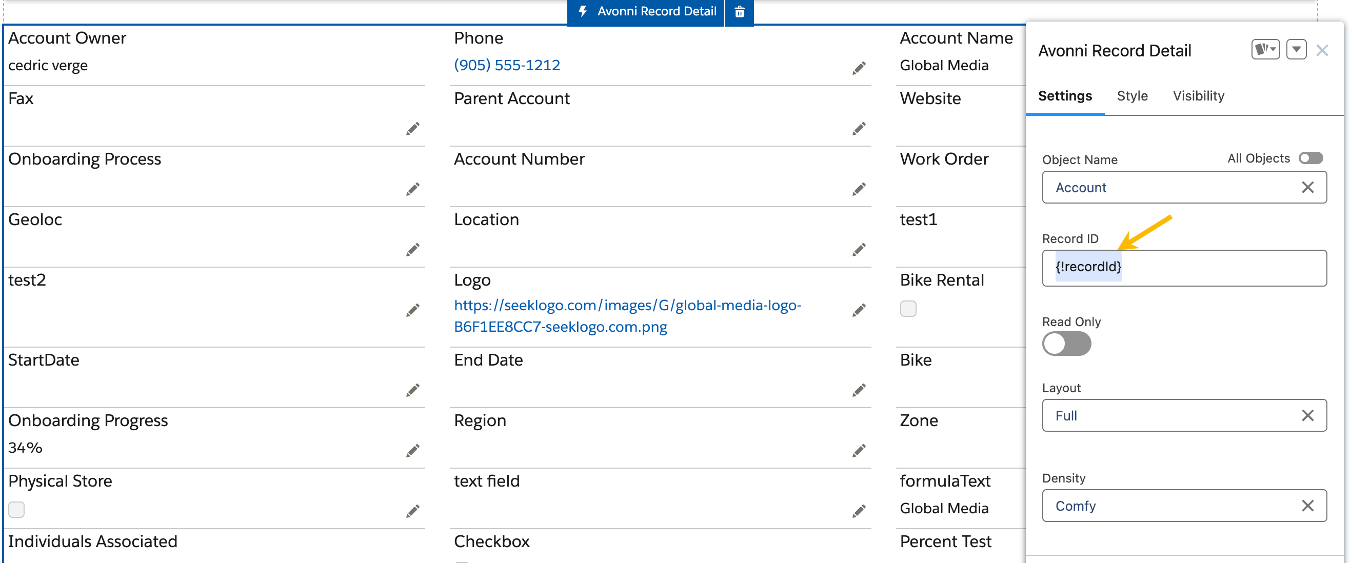 表示したい特定のレコードの一意の識別子を入力します。これにより、コンポーネントが正しい情報を取得して表示します。
