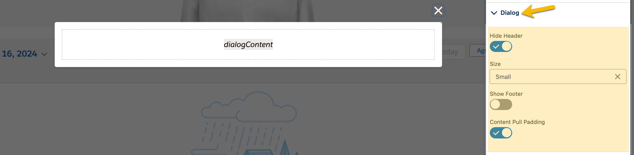 | **Hide Header** | Toggles the visibility of the dialog's header.                                       |