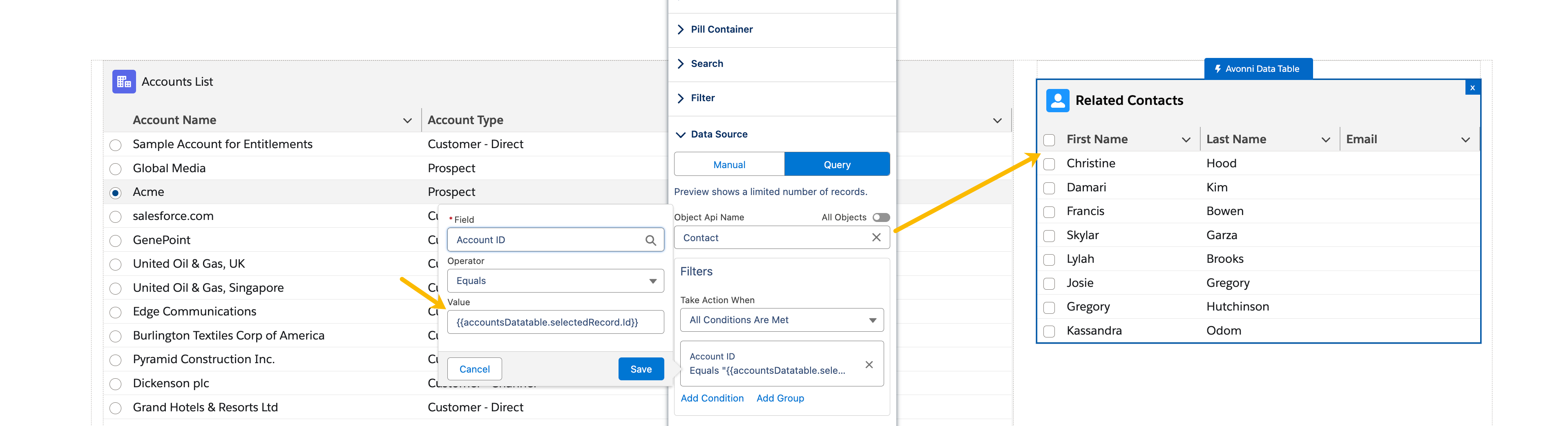 * You can configure the `contactsDatatable` to react to selections in the `accountsDatatable`. For instance, to display the contact name associated with the selected account, use `{{accountsTable.selectedRecord.Id}}`.