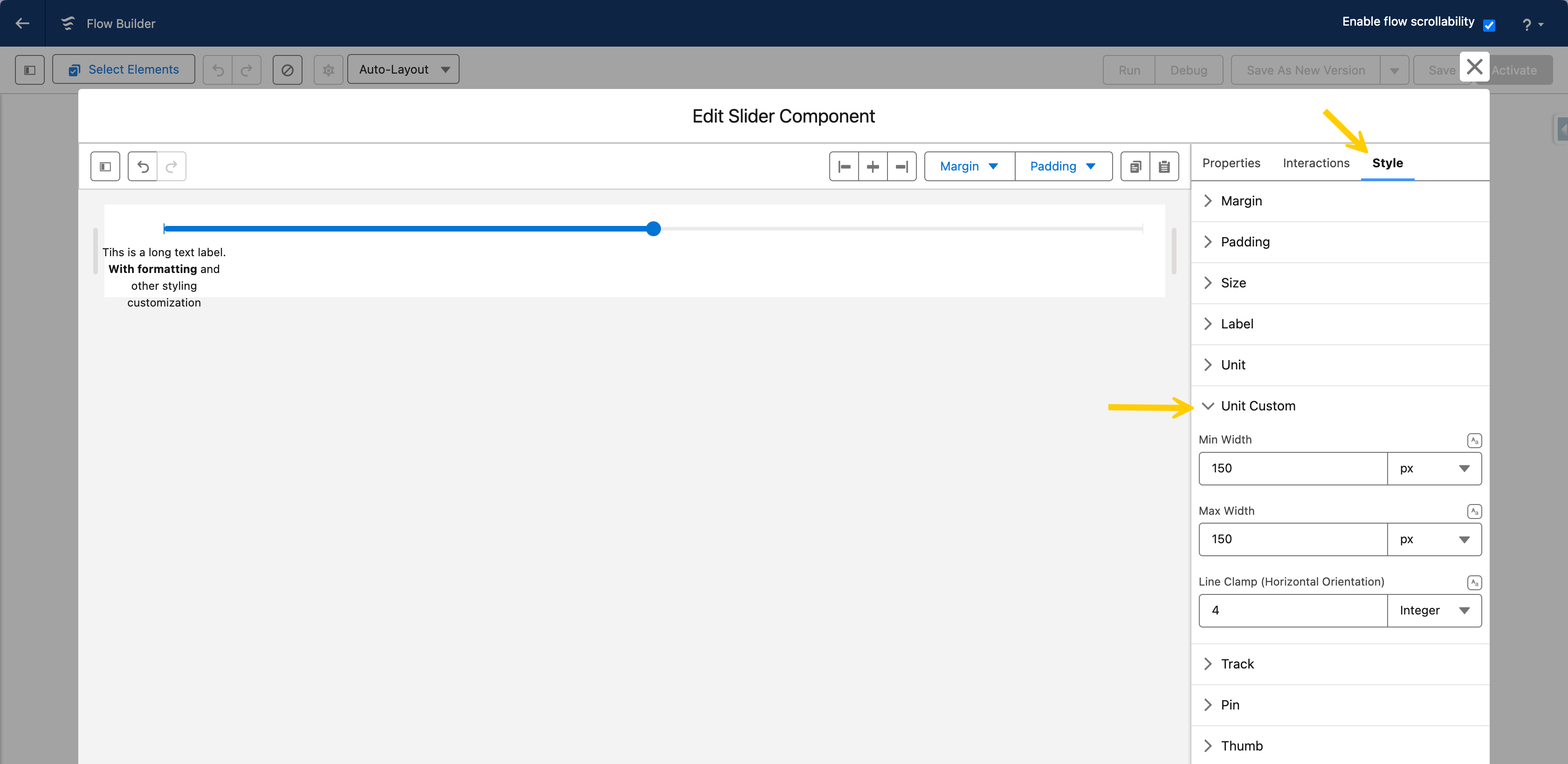 Styling options for custom labels are available in the styling panel, where you can adjust `minWidth`, `maxWidth`, and `line clamp`. This allows you to control the visual presentation and ensure that labels, even long ones, are displayed correctly.
