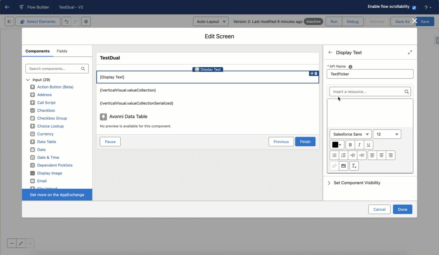 2. **Configure the Display Text component:** In the 'Value' field of the Display Text component, use the formula `{!Visual_Picker.value}` (replace "Visual\_Picker" with the actual API name of your  Visual Picker component).