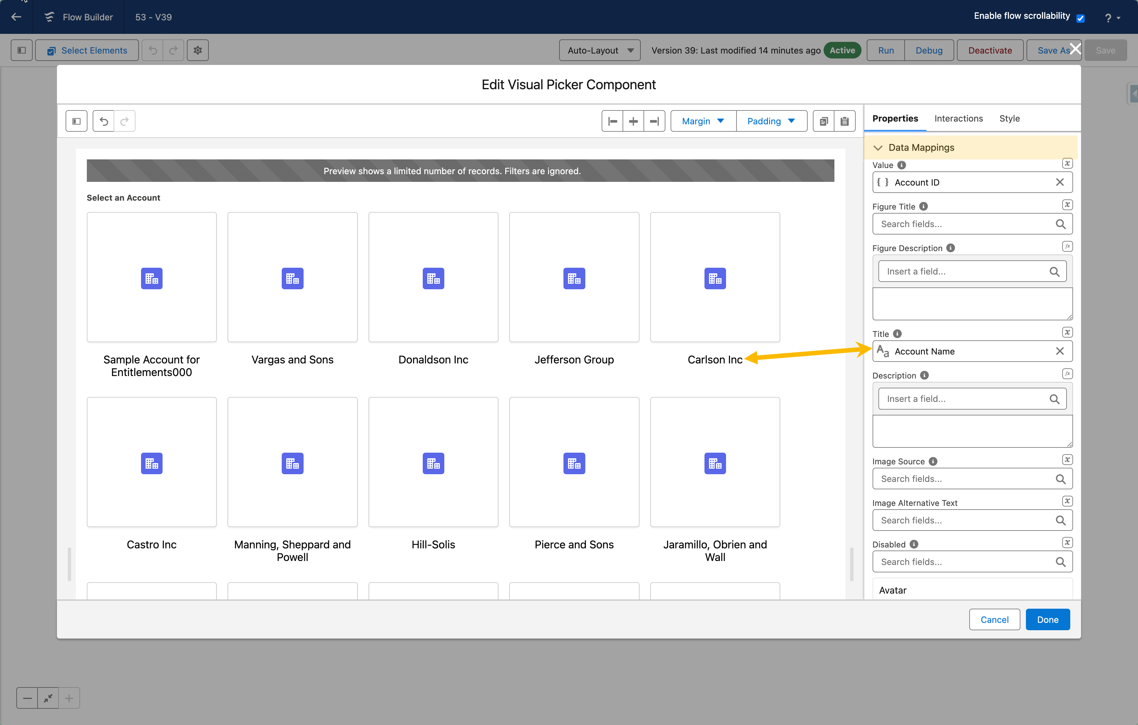In the Data Mappings section, you'll establish the connection between your Salesforce data fields and the corresponding List attributes. By selecting which field maps to which attribute (for example, the "Account Name" field to the "Title" attribute), you ensure each item accurately displays the correct information from your Salesforce data.