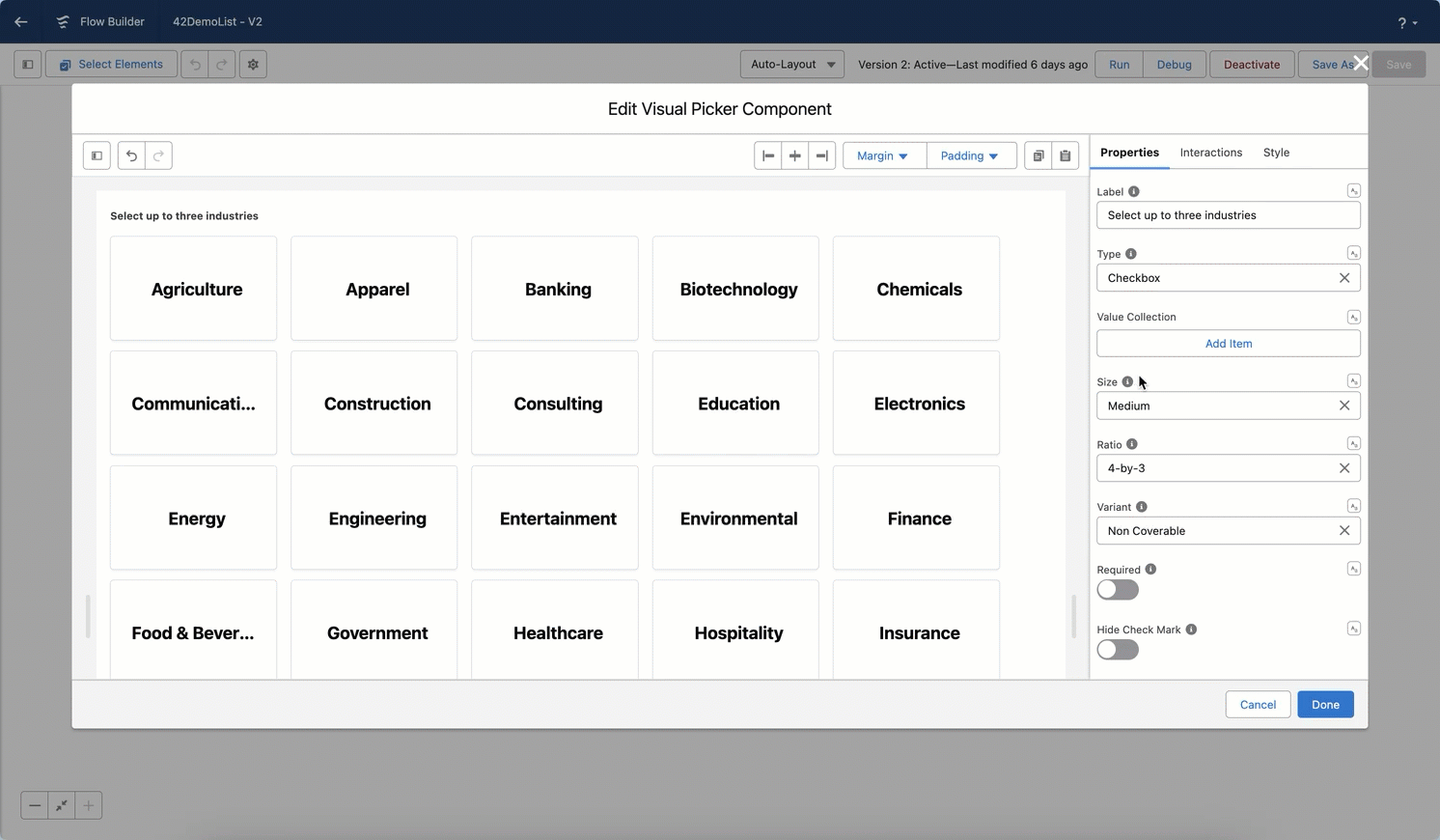 The Visual Picker components now include a 'Selection Range Customization' feature, enhancing your control over item selection. This feature allows you to define minimum and maximum selection limits, particularly useful when utilizing the Checkbox Type.&#x20;