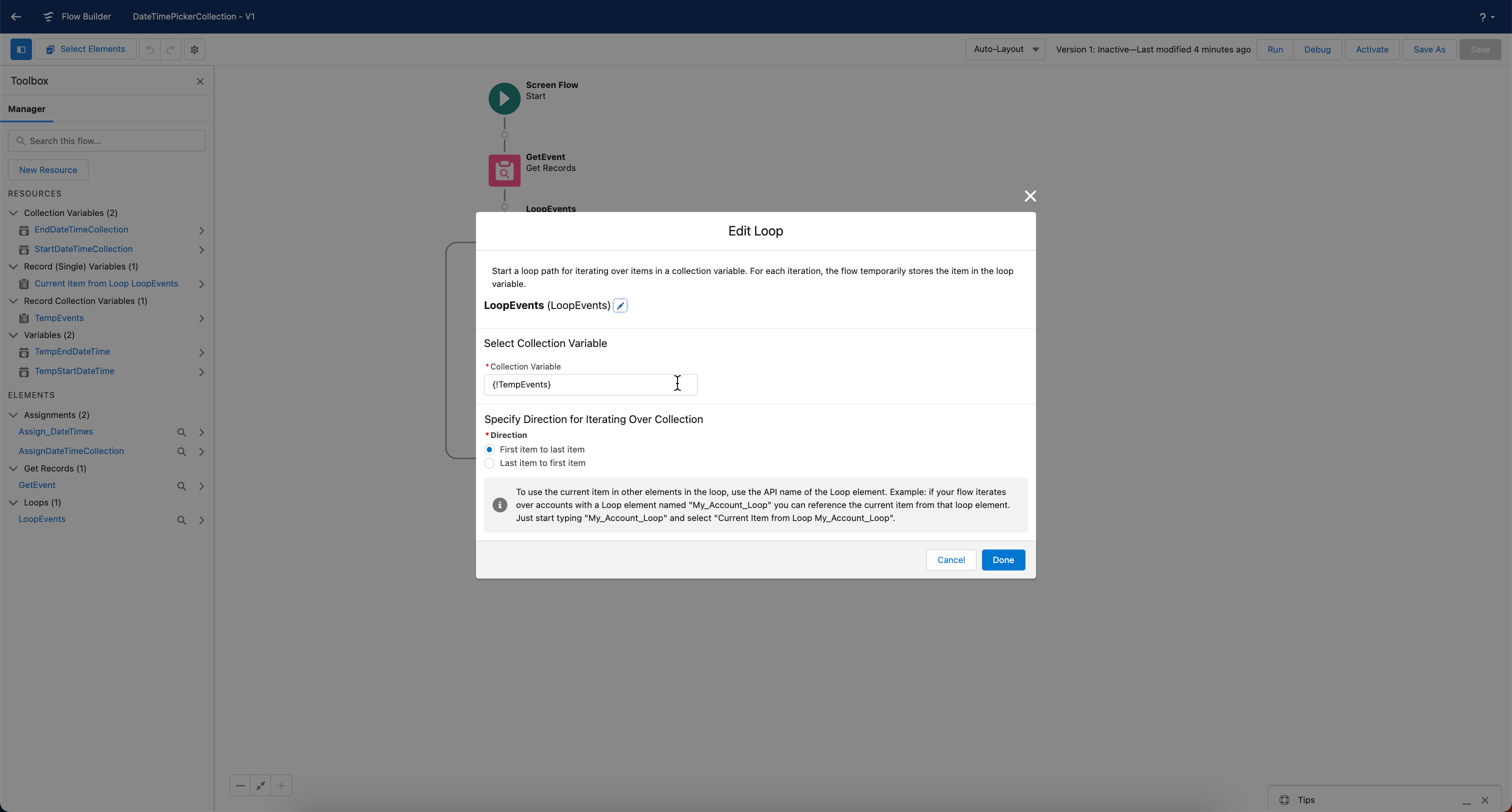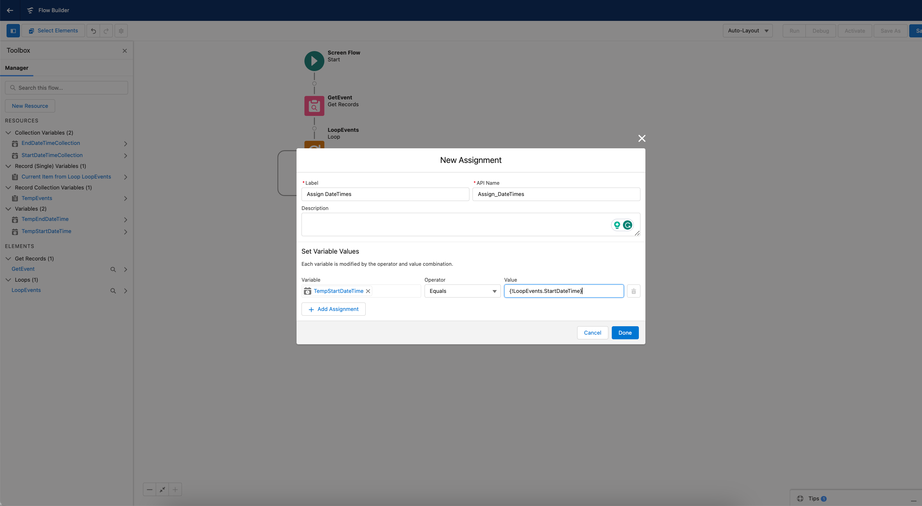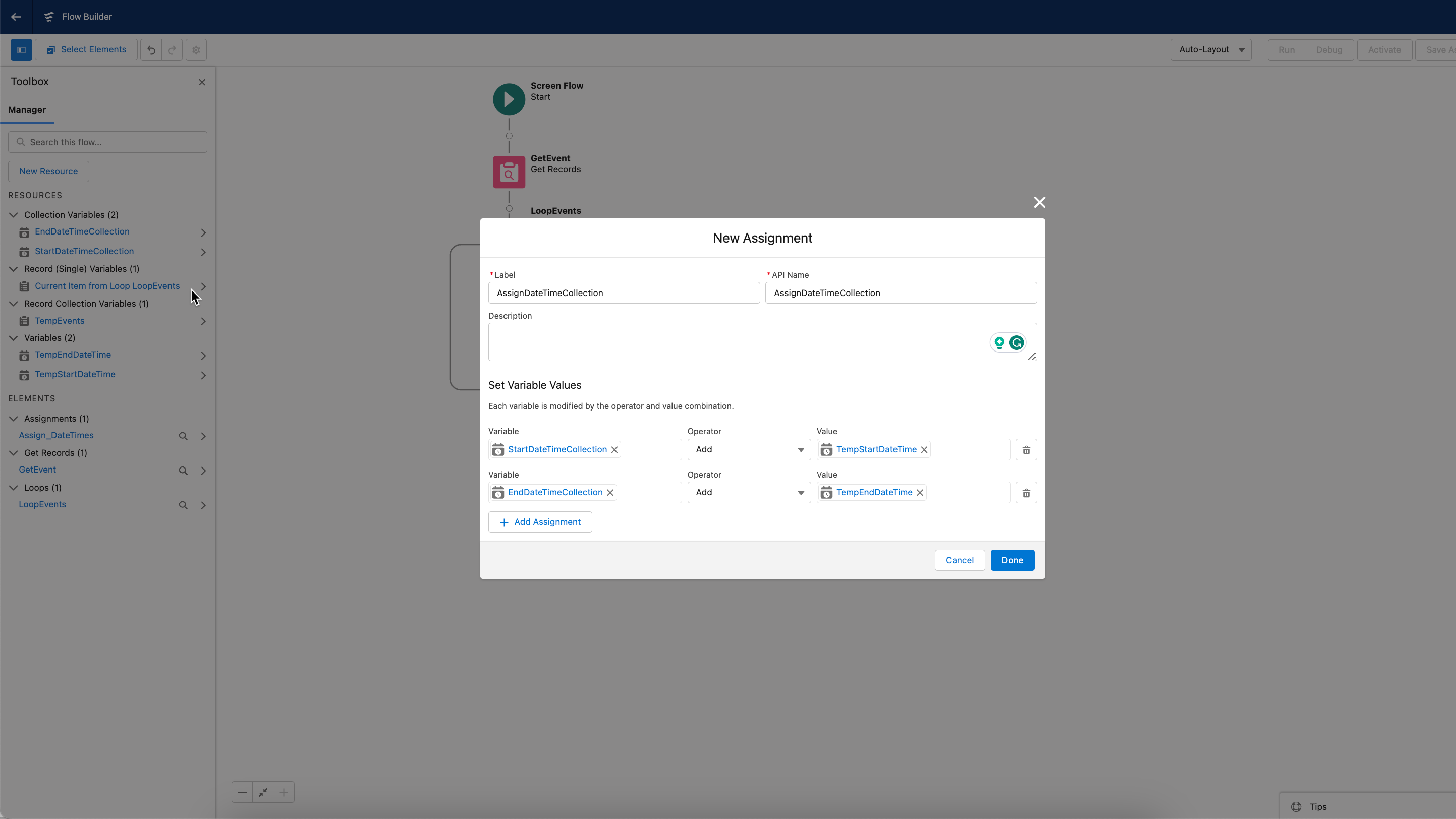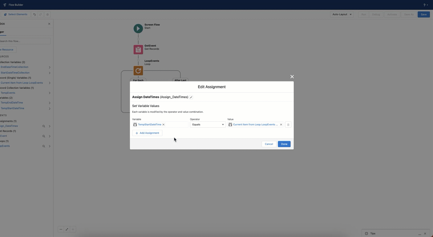 This tutorial is currently a work in progress and provides you with a foundational approach for handling **`StartDateTime`** and **`EndDateTime`** collection variables in Salesforce's Event object using Flow Builder. We are expanding this tutorial to include a specific use case integrating with the [Avonni Date Time Picker](https://docs.avonnicomponents.com/flow/flow-components/date-time-picker) component. Stay tuned for updates!