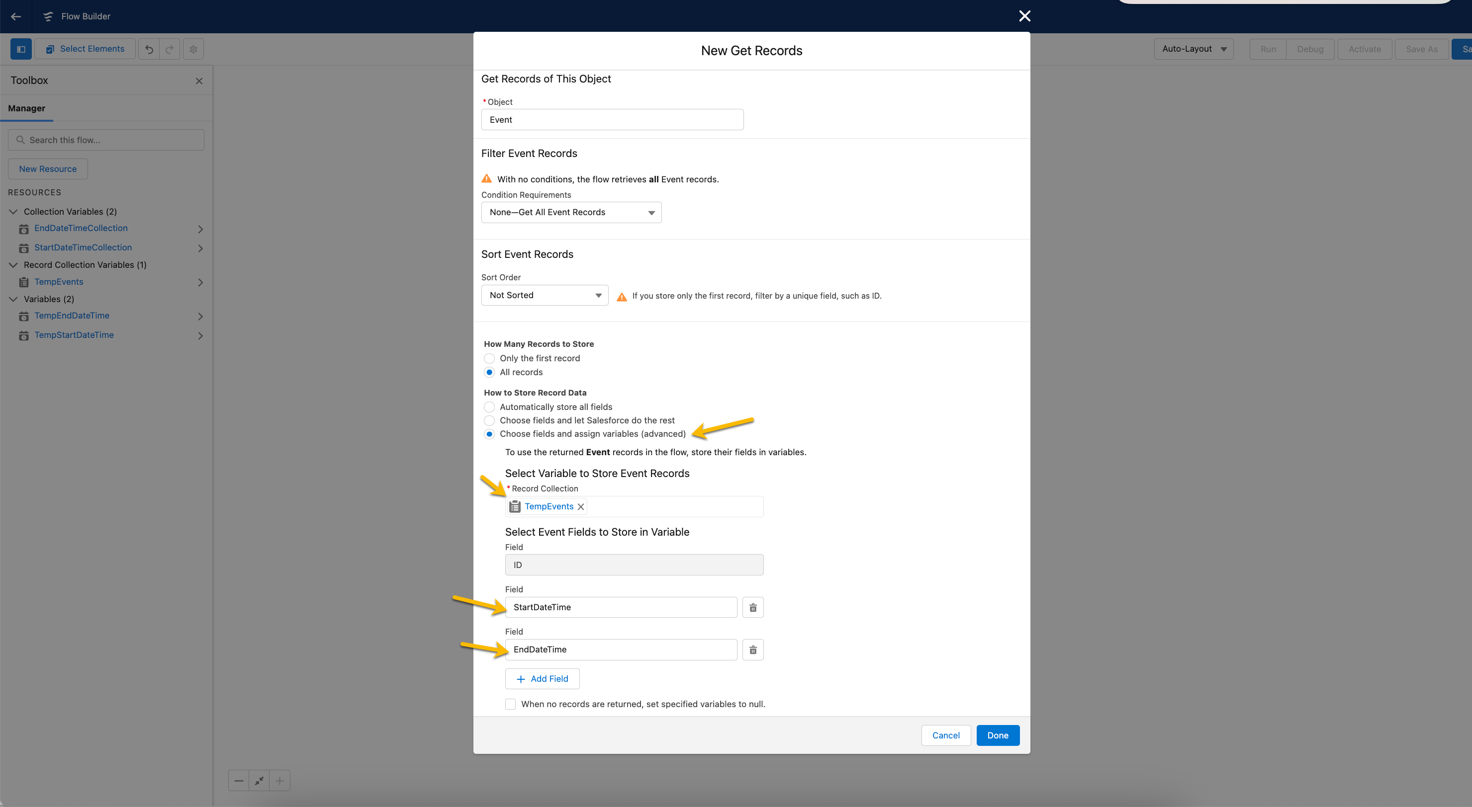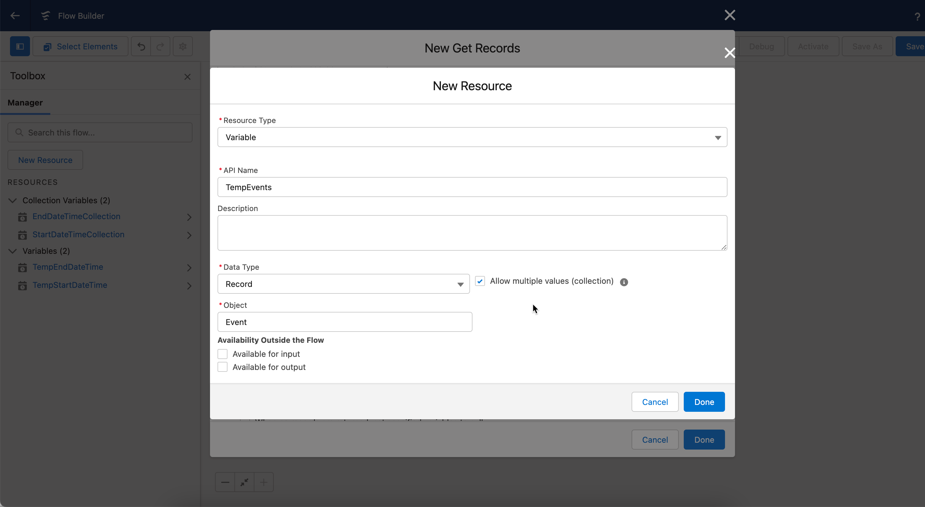 By following these steps, you will have successfully created collection variables for **`StartDateTime`** and **`EndDateTime`** in the Event object of Salesforce. These collections can now be used for various operations and manipulations.