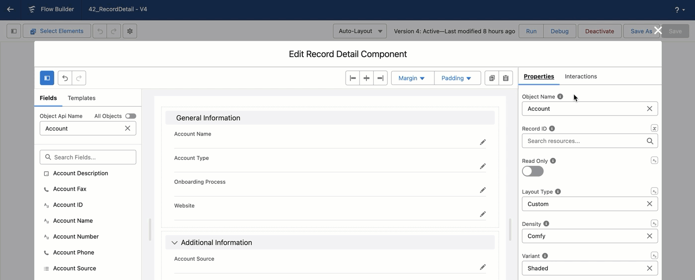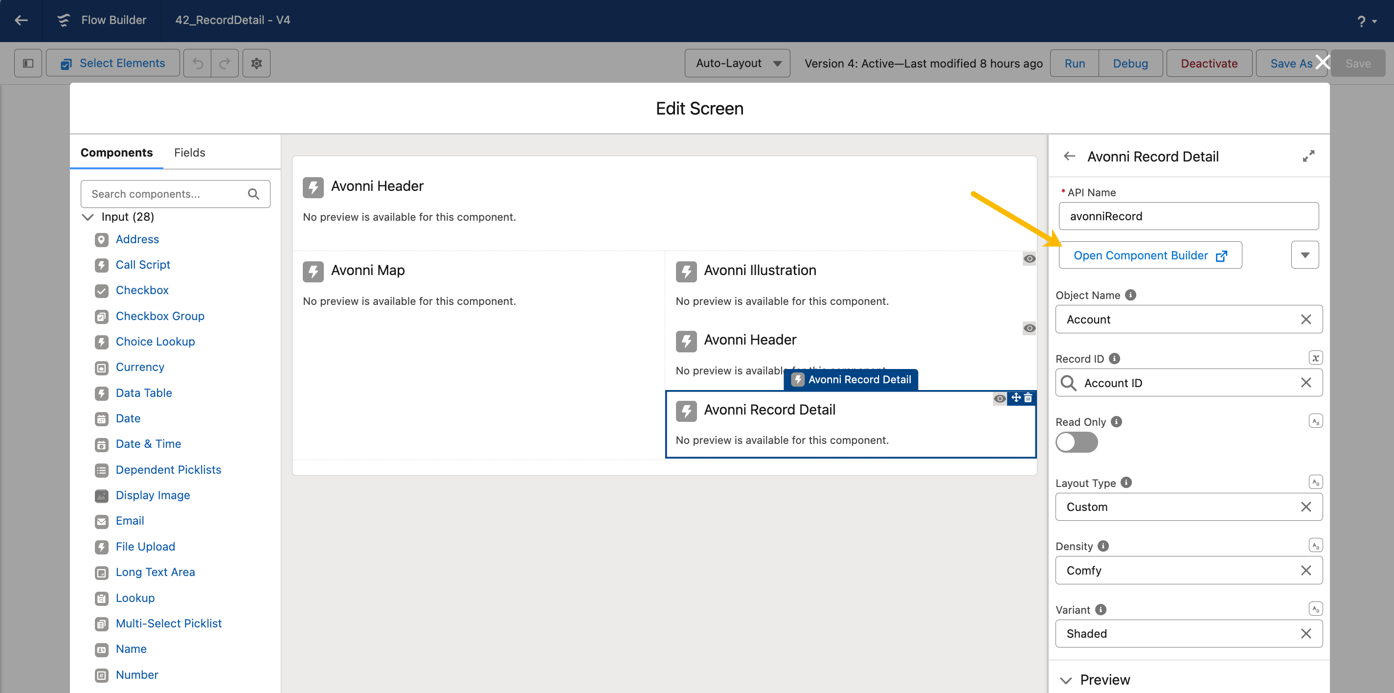 This tutorial guides you through the [Avonni Record Detail component](https://docs.avonnicomponents.com/flow/flow-components/record-detail) setup, which is designed to work interactively with your screen flow. This means the Avonni Record Detail component can communicate and synchronize with other components you're working on within your flow.