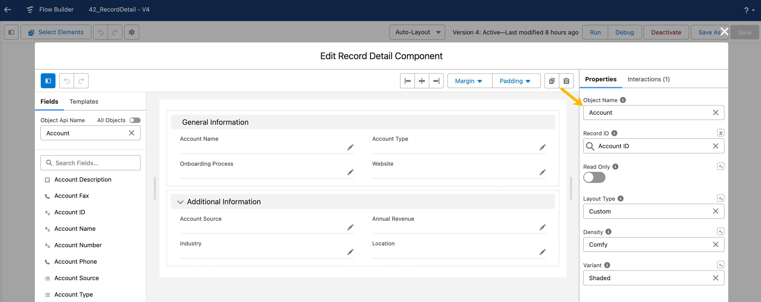 In this example, you should choose the Account object, as it's necessary to display fields related to the Account Object. Remember that we are utilizing Reactivity to select an account on the Avonni Map. Therefore, ensure that the fields displayed in the Record Detail component correspond to and are linked to the Account Object.