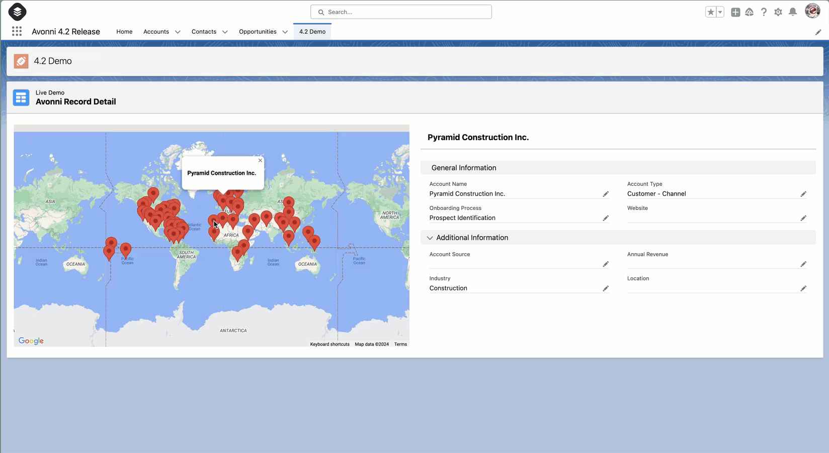 For example, we'll demonstrate this interactivity using the Avonni Map component. We'll display a list of accounts on a map, and on the right side, the Avonni Record Detail component will be shown. This component will interact with the selected map marker, dynamically displaying the corresponding account information.