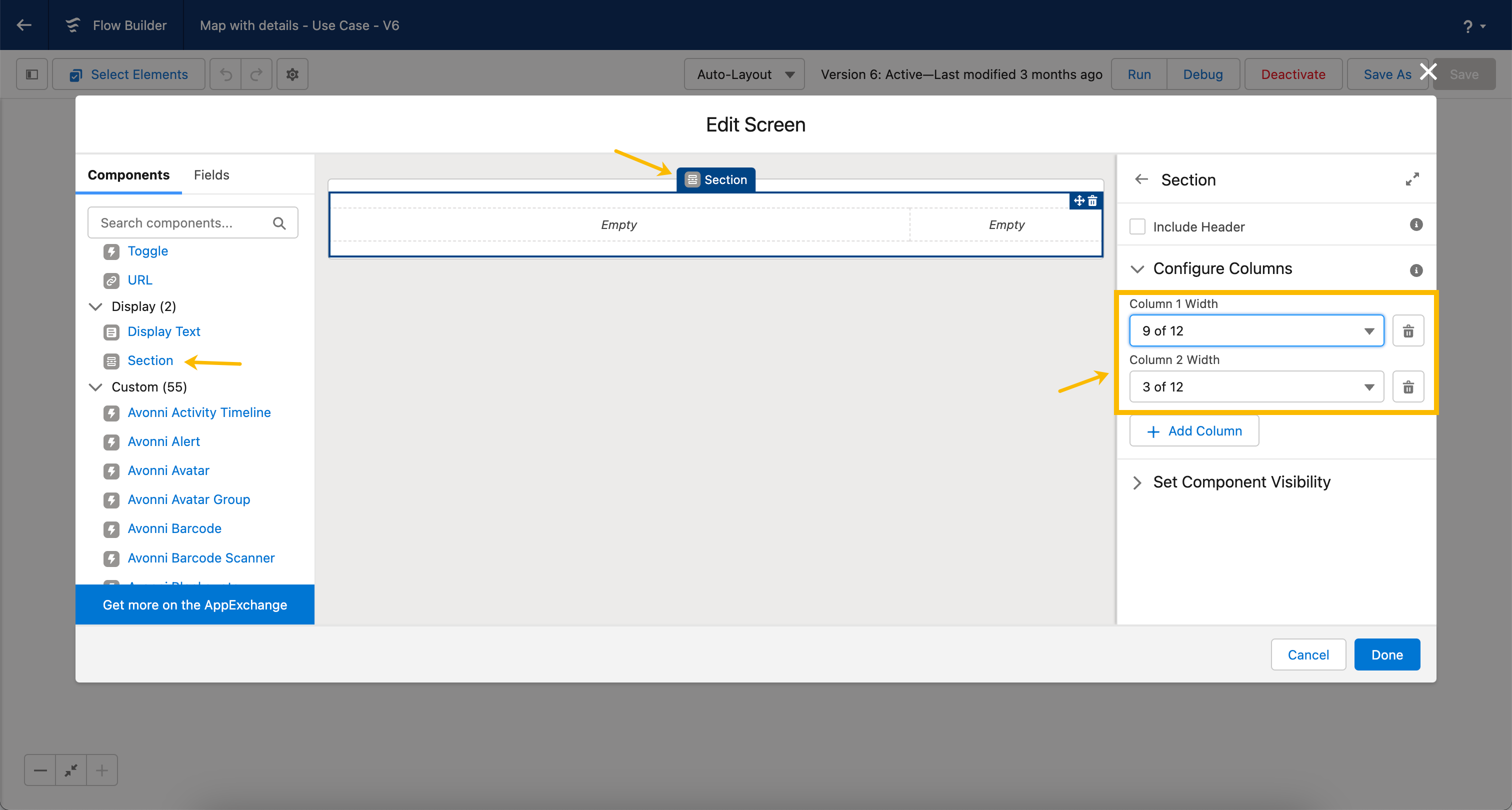 Think of component visibility like stage lights. You want the right things to show up at the right time. For example, we'll make the Avonni Header only appear when an account is selected on the map. Do this for each component to make your flow look polished.&#x20;