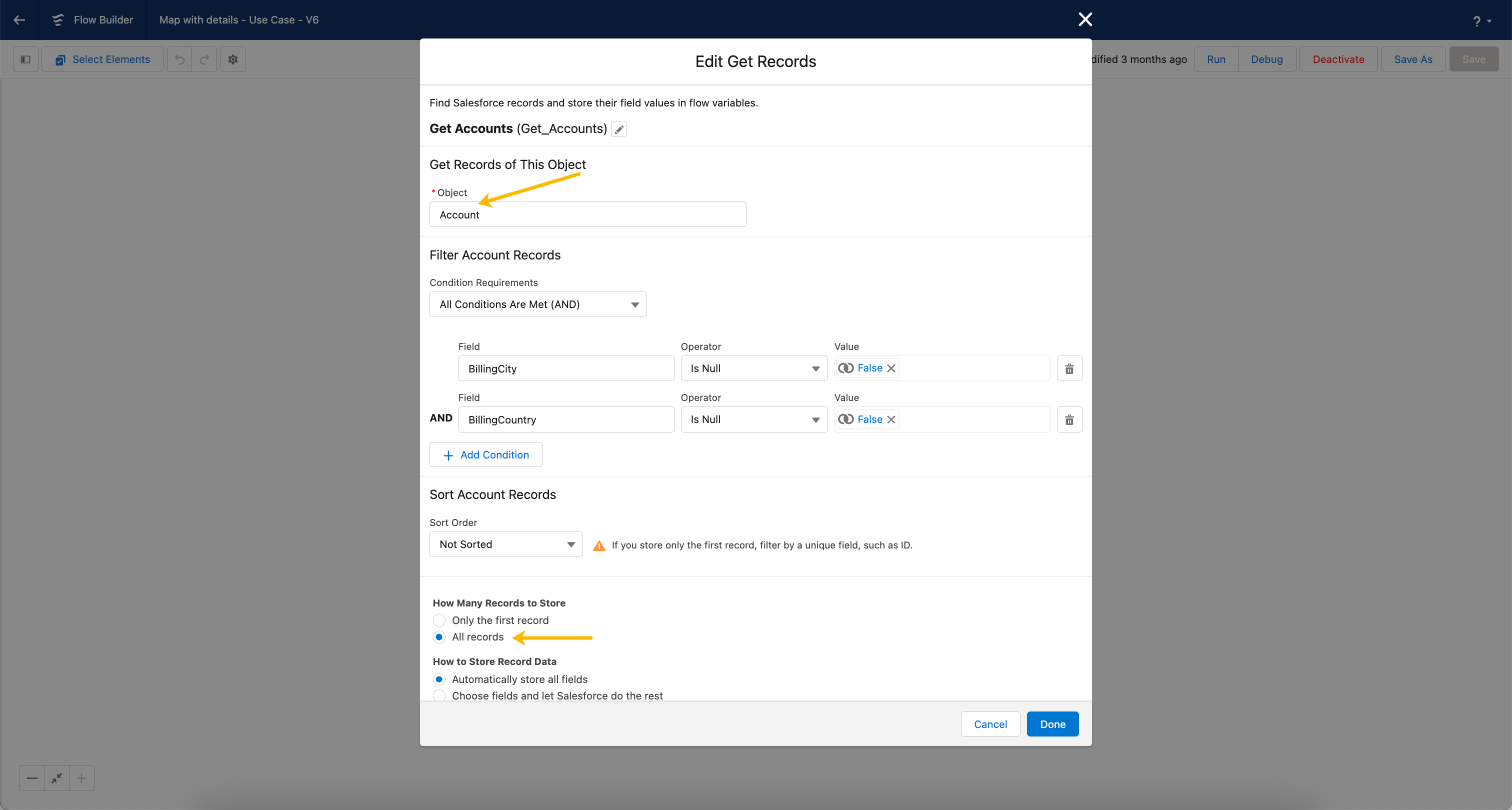 Essentially, the Get Records Collection serves as the data source for our component. It pulls account fields from Salesforce, which are then used to generate map markers based on their associated geographic information.&#x20;