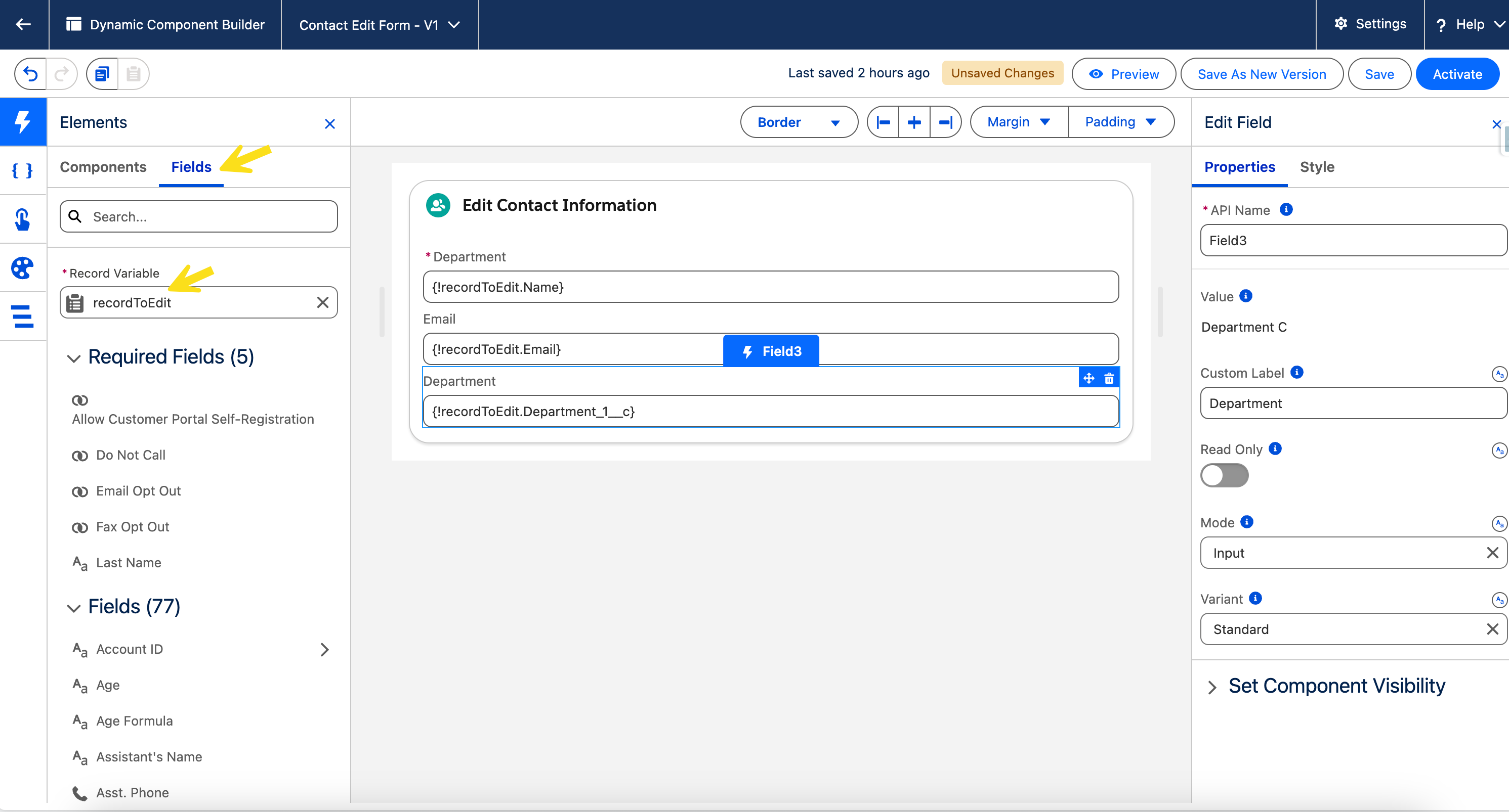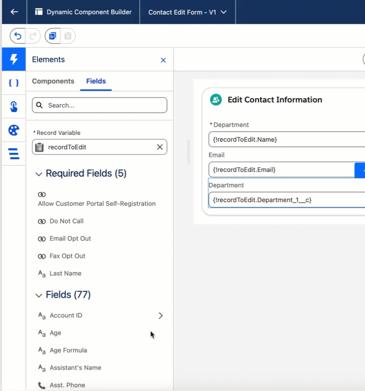 recordToEdit).The Fields tab will now show the fields from your chosen Salesforce object. Drag the desired fields one by one directly into the Card.